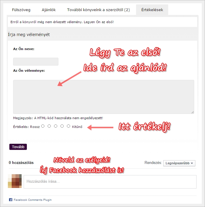 Mindazok között, akik a könyv alatti Facebook komment dobozba (is) írnak értékelést/ajánlót, szintén kisorsolunk egy szerencsést, aki egy választható könyvvel lesz gazdagabb.***